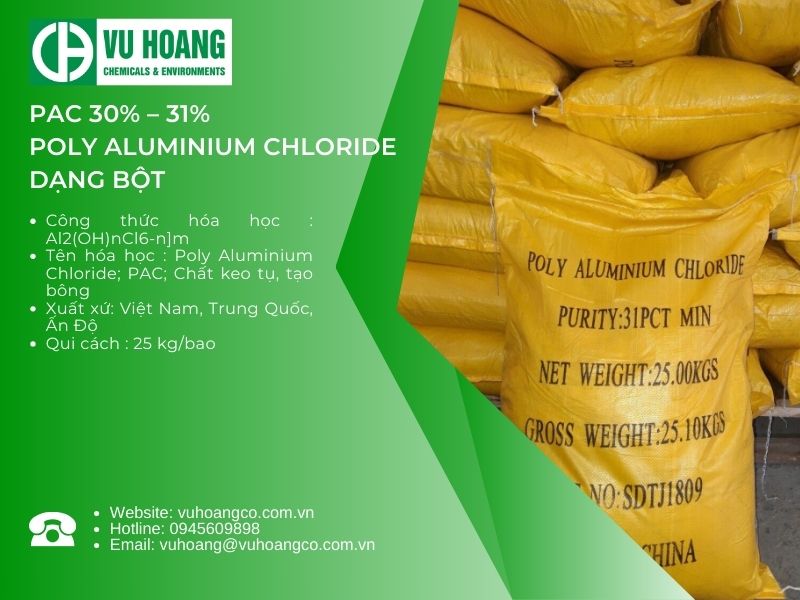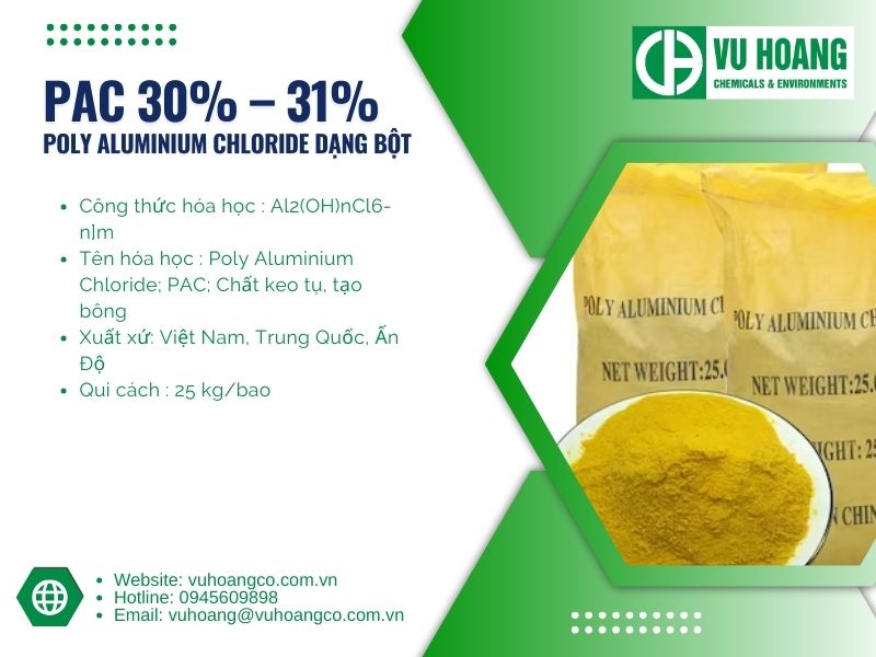 PAC là viết tắt của Poly Aluminium Chloride, một loại muối biến tính của nhôm clorua. Nó tồn tại dưới dạng cao phân tử (polyme) và được sử dụng phổ biến trong việc xử lý nước.